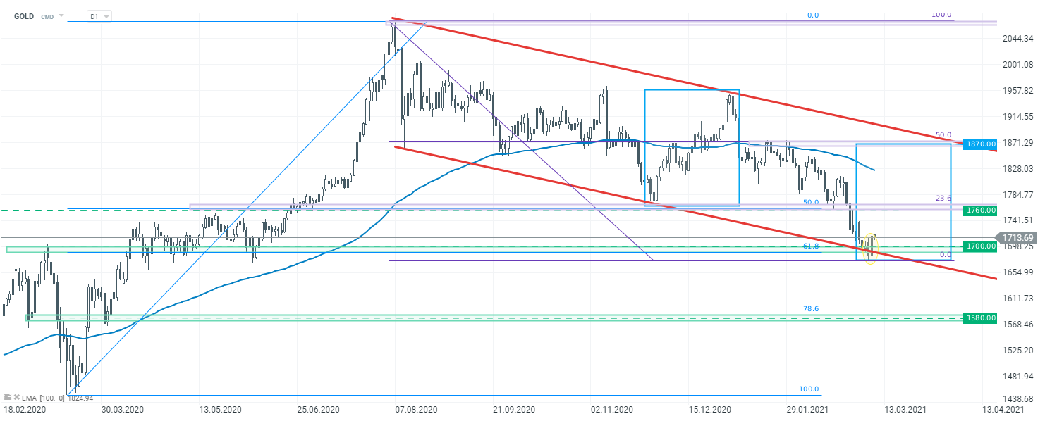 Por último, pero no menos importante, echemos un vistazo al mercado del oro. Al observar el metal precioso desde una perspectiva más amplia, se puede ver que el precio rebotó en un soporte clave a largo plazo de 1.700$, lo que indica una posible corrección al alza mayor. Considerando tal escenario, la resistencia clave a observar se puede encontrar en el límite superior de la estructura 1: 1 (1.879$). Los inversores también deben prestar atención a la resistencia en 1.760$, que está marcada con reacciones de precios anteriores. Por otro lado, si los vendedores logran romper por debajo del soporte de 1.700$ antes mencionado, el camino hacia 1.580$ quedará abierto.