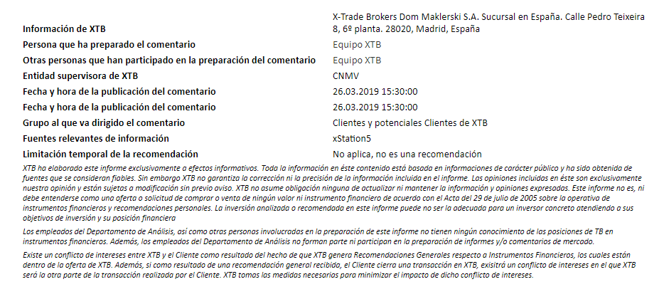 "Este informe se proporciona sólo con fines de información general y con fines educativos. Cualquier opinión, análisis, precio u otro contenido no constituyen asesoramiento de inversión o recomendación en entendimiento de la ley de Belice. El rendimiento en el pasado no indica necesariamente los resultados futuros, y cualquier persona que actúe sobre esta información lo hace bajo su propio riesgo. XTB no aceptará responsabilidad por ninguna pérdida o daño, incluida, sin limitación, cualquier pérdida de beneficio, que pueda surgir directa o indirectamente del uso o la confianza de dicha información. Los contratos por diferencias (""CFDs"") son productos con apalancamiento y acarrean un alto nivel de riesgo. Asegúrese de comprender los riesgos asociados. "