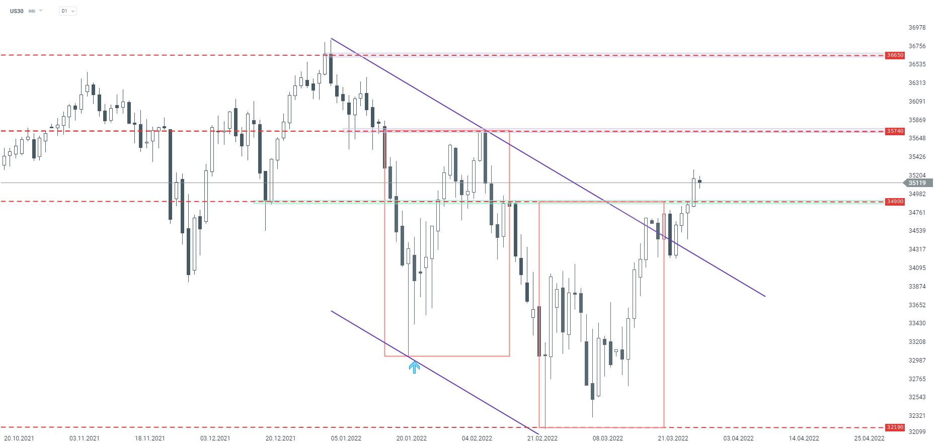 A continuación, veamos la situación del índice estadounidense Dow Jones (US30). Mirando el intervalo D1, podemos ver que el precio está en el camino correcto para volver a la tendencia alcista. El US30 superó la resistencia clave en 34.900 puntos durante la sesión de ayer, que está marcada con el límite superior de una geometría amplia de 1:1. Además, el precio también superó el límite superior del canal de tendencia bajista anteriormente, lo que puede alentar a los toros del mercado a volverse más activos. Si el movimiento alcista continúa, la zona de 35.740 puntos debería considerarse como la resistencia más cercana.