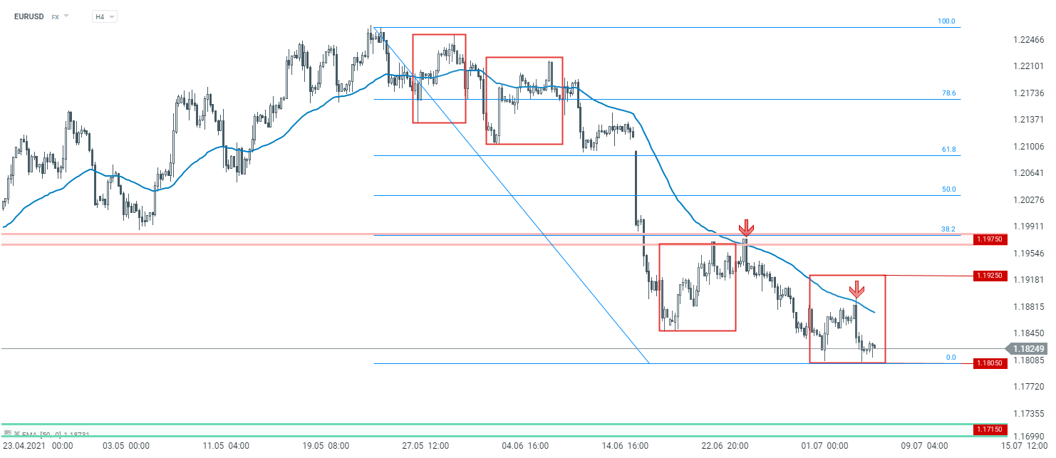 Comencemos el análisis de hoy con el par de divisas principal: EURUSD. Al observar la situación técnica en el intervalo H4, se puede ver que los bajistas del mercado han estado dominando durante algún tiempo. El par se cotiza ligeramente por encima del soporte en 1.1805, pero el sentimiento principal sigue siendo a la baja. Si vemos una ruptura por debajo, el próximo soporte a observar se puede encontrar en 1,1715. Por otro lado, si los compradores logran detener el movimiento a la baja aquí, se puede lanzar una corrección al alza. La corrección reciente alcanzó el promedio móvil de 100 períodos y debería actuar como una resistencia clave en una perspectiva a corto plazo. La siguiente resistencia a observar es 1,1925, donde se encuentra el límite superior de la estructura 1: 1.