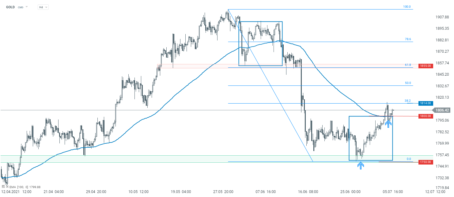 A continuación, echemos un vistazo al mercado del oro. Al analizar el gráfico en el intervalo H4, se puede ver que el metal precioso rebotó en el área de soporte clave en $ 1,750. Los compradores también lograron llevar el precio por encima del límite superior de la estructura 1: 1, que de acuerdo con la estrategia Overbalance puede presagiar un regreso a la tendencia alcista. Si prevalece el sentimiento actual, el movimiento alcista puede extenderse hacia la próxima resistencia en $ 1,855. Por otro lado, retroceder por debajo de los $ 1,800 puede alentar a los bajistas del mercado a ser más activos.
