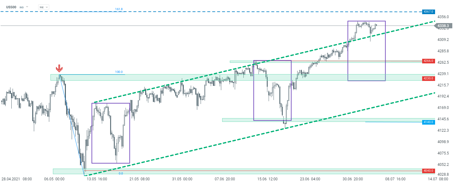 Por último, pero no menos importante, echemos un vistazo al índice estadounidense: S&P 500 (US500). Al observar el intervalo H4, se puede ver que el índice volvió a alcanzar un nuevo máximo histórico esta semana. Ayer se produjo una fuerte corrección tras la reapertura de los mercados de contado tras el fin de semana largo. Sin embargo, los compradores recuperaron rápidamente el control y el precio rebotó en el límite superior de un canal alcista roto anteriormente, lo que debería considerarse un soporte clave en la perspectiva a corto plazo. Si los compradores logran mantener el impulso actual, el nivel de 4,367 pts será el objetivo potencial para los toros del mercado. Sin embargo, si se produce la corrección a la baja, el próximo soporte a vigilar está marcado con una reacción previa del precio en 4.266 pts.