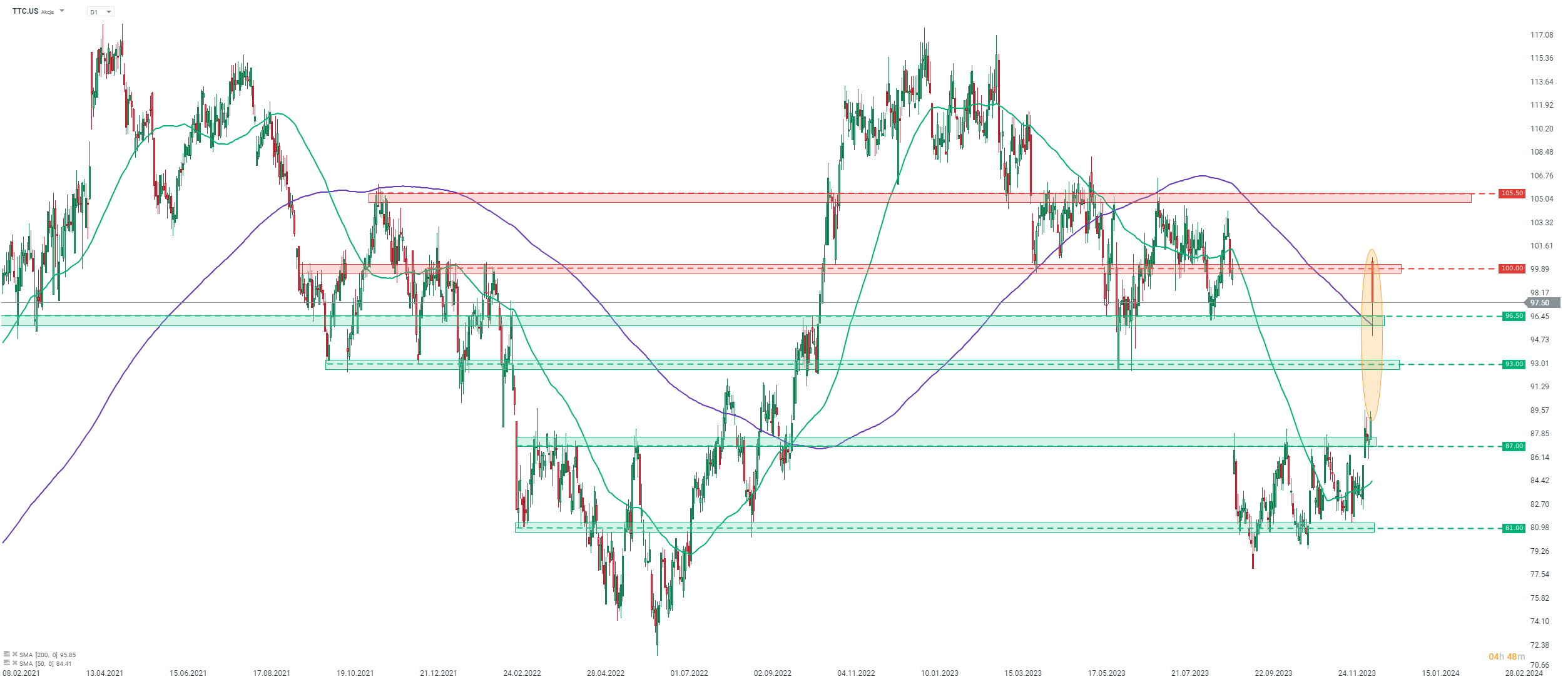 Echando un vistazo al gráfico de Toro (TTC.US) en el intervalo D1, podemos ver que inició la negociación de hoy con una enorme brecha de precios alcista y una zona de resistencia probada en el área de $100 después de que comenzó la sesión de efectivo. Sin embargo, los alcistas no lograron mantener esas alzas y el precio de las acciones comenzó a bajar. Sin embargo, este retroceso parece haberse detenido en la zona de soporte que oscila entre el promedio móvil de 200 sesiones (línea morada) y el nivel de 96,50 dólares, y está marcado por una reacción previa del precio.