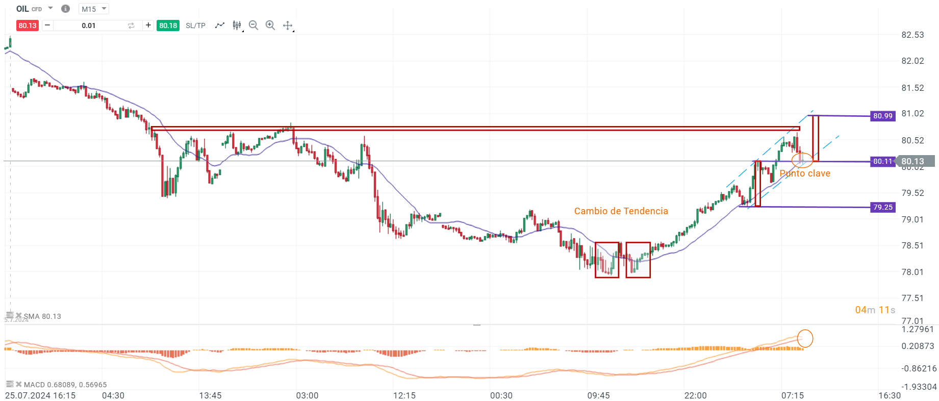 El precio del petroleo ha realizado un reciente movimiento alcista, del cual esta siendo marcado por un punto de soporte clave en los 80.11. De respetar este nivel, el precio podria realizar un nuevo impulso hacia los 80.99, en el caso de una ruptura bajista el precio podria retroceder hacia los 79.25.