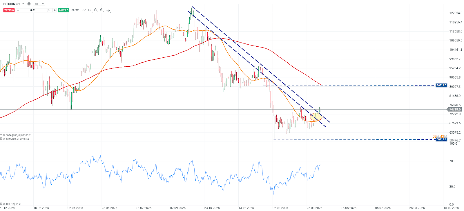 Desde el punto de vista técnico, el precio muestra una estructura de giro desde su punto pivote en 59.713 dólares, junto con una ruptura de la directriz bajista iniciada el 4 de octubre. Aun así, Bitcoin mantiene una distancia aproximada del 15% respecto a su media móvil de 200 días, mientras que el RSI continúa avanzando sin alcanzar todavía niveles de sobrecompra, lo que sugiere que el impulso alcista aún podría tener margen, aunque con una resistencia técnica relevante por delante.