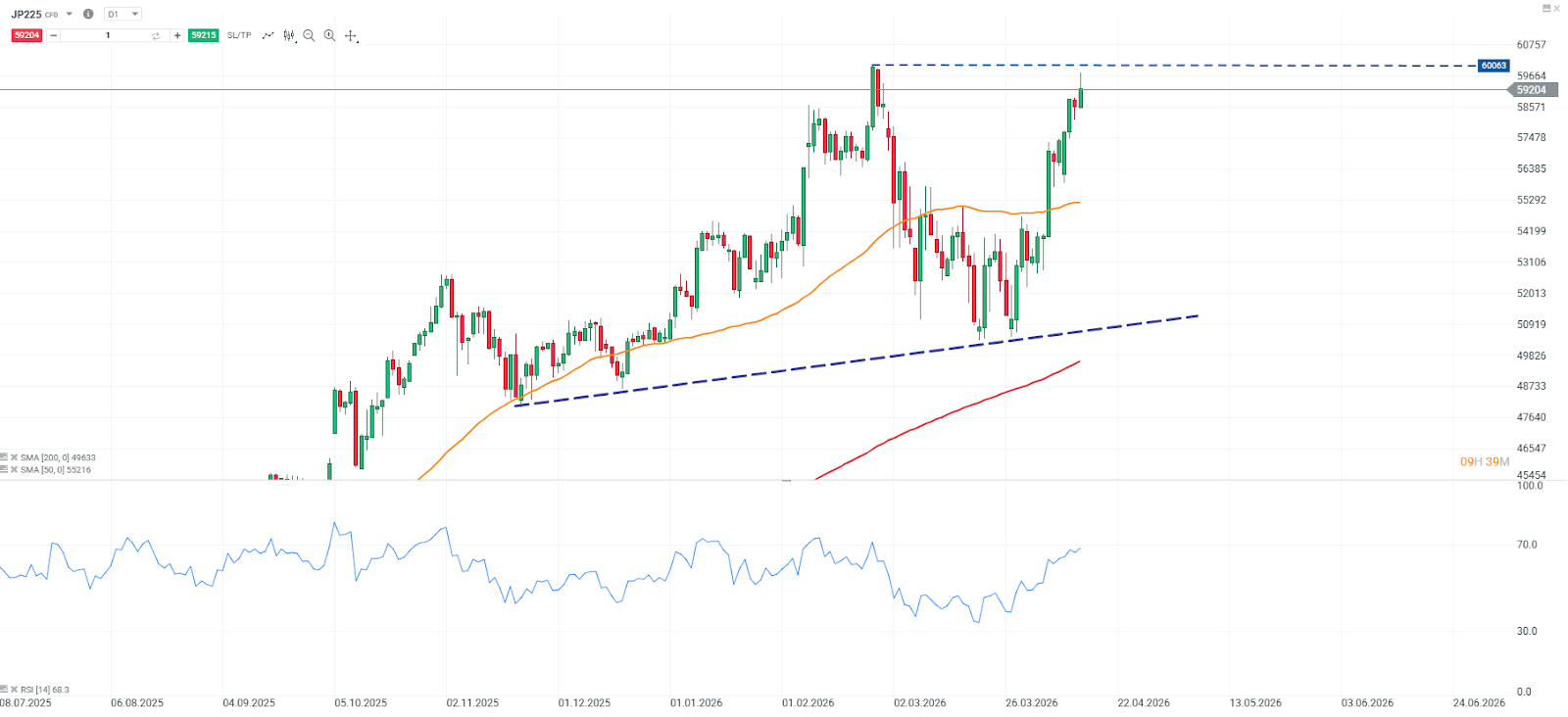 El JP225 superó los 59.000 puntos, impulsado por la mejora del sentimiento de mercado tras la caída del petróleo y por unos pedidos de maquinaria en Japón muy por encima de lo esperado en febrero, con un avance de 13,6% mensual frente al -1,1% previsto, y de 24,7% interanual frente al 8,5% estimado. El índice logra así recuperar el nivel de 59.000, apoyado además por las expectativas de una posible resolución del conflicto en Oriente Medio y por el liderazgo del sector tecnológico. Desde el punto de vista técnico, el precio se encuentra a solo 1,6% de sus máximos históricos, mientras el RSI mantiene un momentum alcista y la cotización se consolida por encima de su media móvil simple de 50 días.
