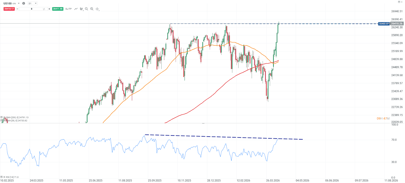 - El Nasdaq 100 marca nuevos máximos apoyado en tecnológicas, aunque indicadores como el RSI muestran divergencias bajistas, sugiriendo que el rally podría perder fuerza a corto plazo pese a la tendencia alcista.