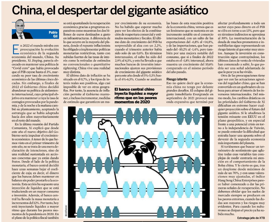En 2022 el mundo miraba con preocupación la evolución económica de la segunda economía del mundo, China. Su presidente, Xi Jinping, parecía obcecado en mantener una política de "Covid cero" que había provocado que el PIB cayese hasta el 3%, marcando su peor tasa de crecimiento económico de las últimas cinco décadas. Sin embargo, a finales de 2022 el Gobierno chino decidió abandonar su política de aislamiento internacional, cuyo principal objetivo era mantener a raya la tasa de contagios provocados por la pandemia, y de la noche a la mañana cambió su planteamiento, aceptando la estrategia que se había adoptado hacía dos años mayoritariamente en el resto del mundo.