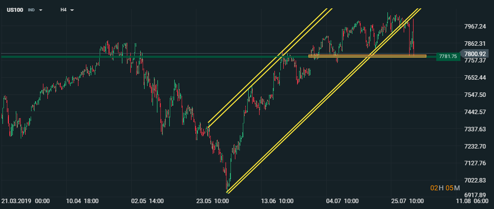 Como la historia lo ha demostrado, los inversores están atentos a cualquier publicación de Trump en su cuenta de Twitter. Ante comentarios como estos el mercado reacciona bastante rápido. De hecho la Bolsa americana reacciono de inmediato. El S&P500, se dejó un 2,15%, el Nasdaq un 2,8% consolidando un nuevo suelo en la zona de 7778 puntos, apartándose del canal alcista que viene desde inicio de Junio.