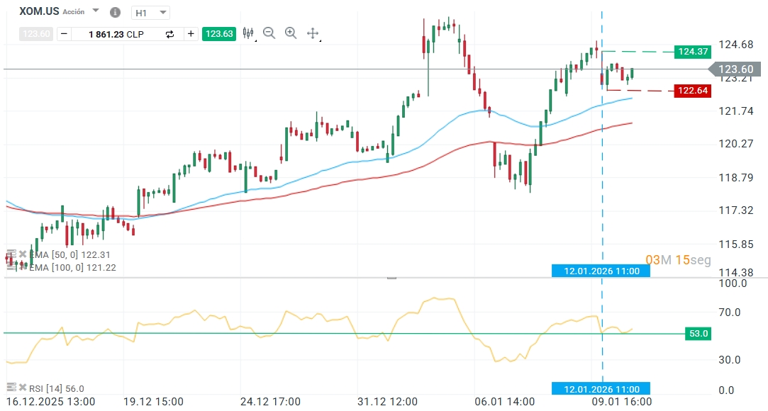 En el gráfico de 1 hora, XOM.US mostró presión vendedora tras el titular político asociado a Venezuela, con un retroceso intradía hasta la zona de US$122,64 (aproximadamente -1,39% en la sesión). Aun así, el movimiento no vino acompañado de señales de capitulación. El RSI (14) se mantuvo en una zona neutral, oscilando en torno a 53 – 56, lo que sugiere que no hay condiciones de sobreventa pese a la corrección.