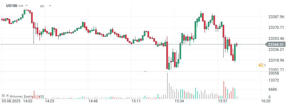 En cuanto al índice US100 (Nasdaq 100), se observa una venta generalizada de acciones con un aumento en el volumen de ventas (barras rojas en el gráfico). No obstante, la reacción general del mercado se mantiene equilibrada, a pesar de los datos desfavorables para el mercado bursátil.