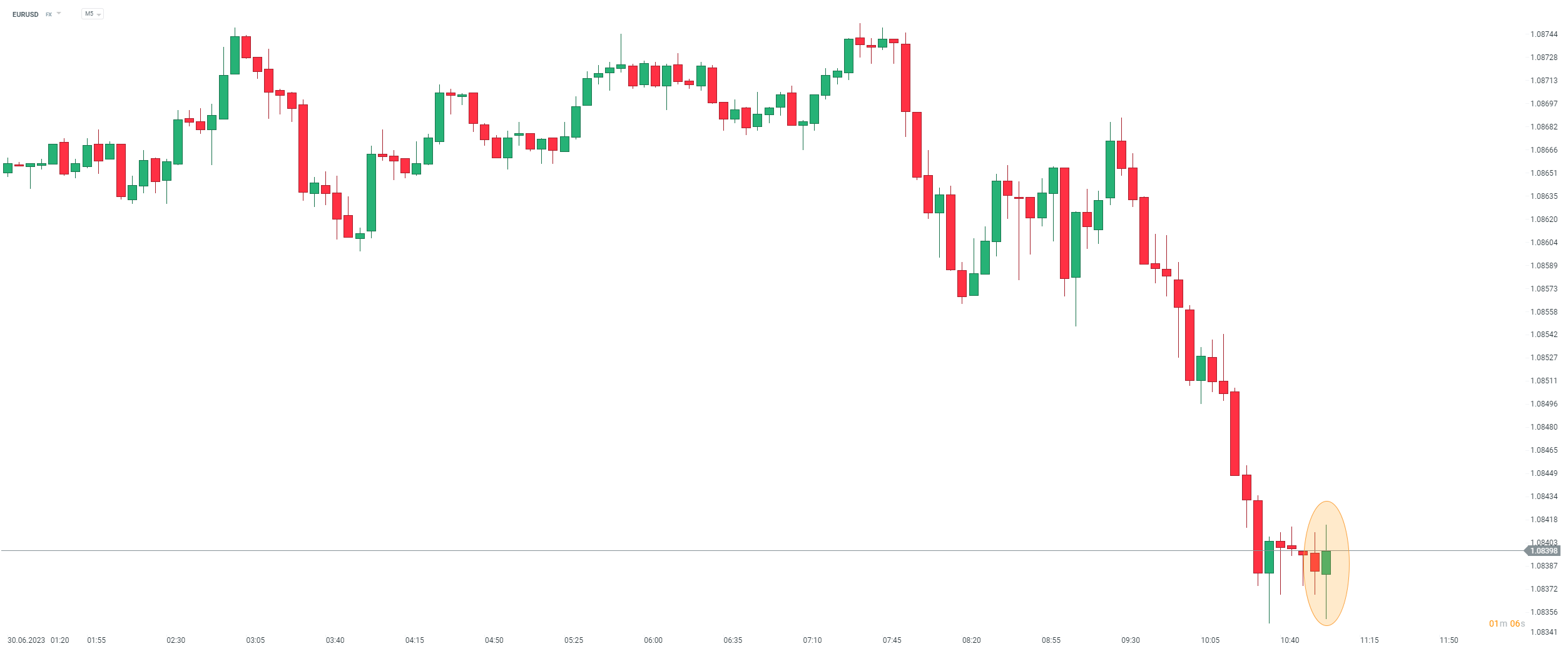 El informe de inflación del IPC de junio para toda la zona del euro se publicó hoy a las 11:00h CEST . Había una sensación de que la lectura podría sorprender al alza después de que las lecturas españolas y alemanas mostraran sorpresas al alza ayer. Sin embargo, el informe real mostró una sorpresa pesimista: el IPC general se desaceleró del 6,1 al 5,5 % interanual en junio, más del 5,6 % interanual esperado. Mientras tanto, el indicador base acelerado por la aceleración fue menor de lo esperado: de 5,3 a 5,4 % interanual. La reacción de los mercados fue bastante moderada: el EURUSD subió, pero la escala de ganancia no superó el 0,05%.