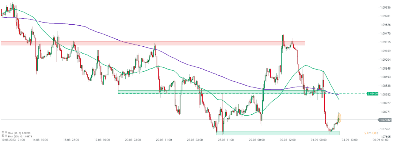 El par EUR/USD apenas reaccionó a la caída del índice Sentix. El par continúa cotizando ligeramente por debajo del nivel de 1,08 $. Fuente: xStation5