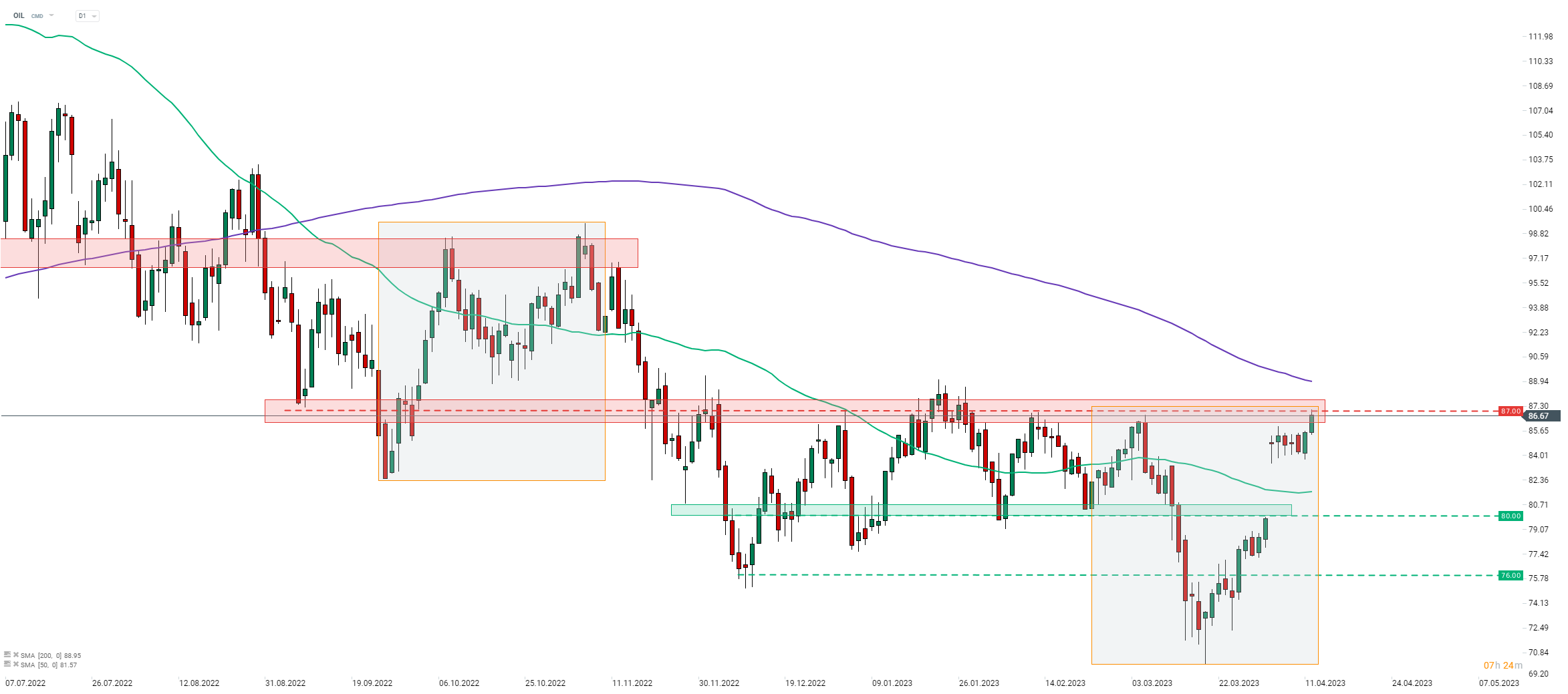 Aunque el petróleo ha estado bastante moderado después de la publicación de los datos del DOE, los precios del crudo están en alza hoy. Brent (OIL) está intentando romper por encima del límite superior de la estructura de desequilibrio en el área de $87.00 por barril. Fuente: xStation5.
