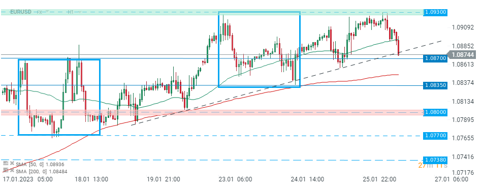 El par EURUSD retrocedió hasta el soporte en 1.0870 después del paquete de datos de EE. UU. de hoy. Fuente: xStation5