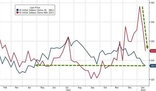 - Solicitudes de desempleo: 186vs 205k esperado (190k anteriormente), el más bajo desde abril y es otra señal de un mercado laboral ajustado a pesar de la agresiva ruta de ajuste de la Fed el año pasado, desafiando las apuestas del mercado de que el banco central de EE. UU. detendrá su ruta de ajuste antes de alcanzar el tasa terminal pronosticada de 5.25%.