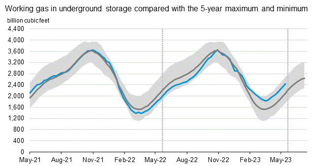 El gas de trabajo almacenado era de 2446 Bcf al viernes 26 de mayo de 2023, según estimaciones de la EIA. Esto representa un aumento neto de 110 Bcf con respecto a la semana anterior. Las existencias eran 557 Bcf más altas que el año pasado en este momento y 349 Bcf por encima del promedio de cinco años de 2097 Bcf. Con 2446 Bcf, el gas de trabajo total está dentro del rango histórico de cinco años.