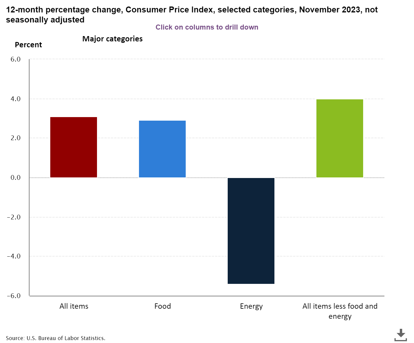 La variable de la energía cayó un 2,3% durante el mes debido a una caída del 6,0% en la gasolina más que compensaron los aumentos en otros índices de componentes energéticos. El índice de alimentos aumentó un 0,2 por ciento en noviembre, aunque por debajo del 0,3% en octubre.