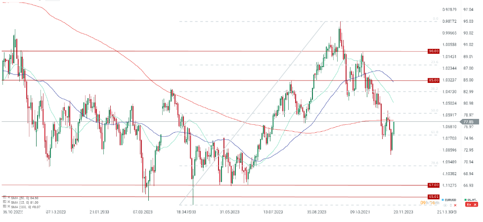 El barril de WTI se acerca al nivel de la media móvil simple (200 sesiones). La resistencia clave está alrededor de los 80$ en el retroceso de 50 de la última onda ascendente.
