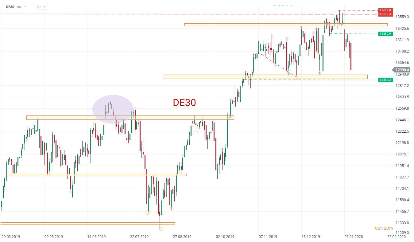 El viernes comenzó de buen humor después de los fuertes beneficios de las acciones tecnológicas de Estados Unidos, pero termina en un pánico incontrolado, especialmente en Europa, donde las acciones acumulan entre 2 y 2.5% de caída. Los inversores se enfrentan a la incertidumbre del virus y los datos publicados hoy (contracción del PIB en Francia e Italia, el PMI de Chicago más bajo en 4 años) muestra que la economía ha estado luchando incluso antes del impacto del virus. DE30 ve la peor caída desde principios de diciembre y está solo un nivel por encima de la zona de soporte clave de 12900 puntos. Hace unos días advertimos que la ruptura falsa se parecía a la de julio y este es el escenario que parece estar desarrollándose ahora.