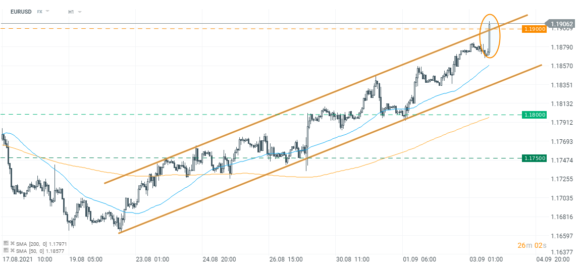 El EURUSD se disparó después de la falla NFP y el par probó la marca de 1,19. Vale la pena notar que el par de divisas principal saltó por encima del límite superior del canal ascendente. Fuente: xStation5