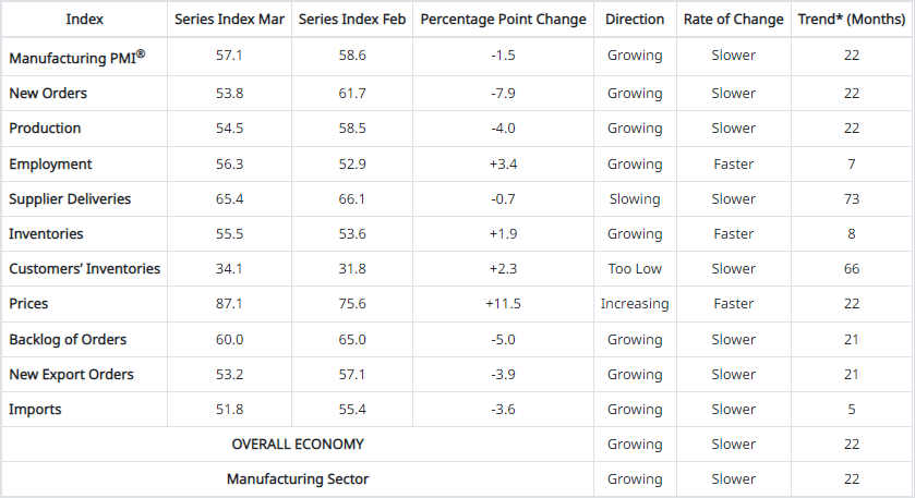 - El ISM Manufacturing PMI para EE. UU. cayó a 57,1 en marzo desde 58,6 en el mes anterior, muy por debajo de las expectativas de los analistas de 59,0.