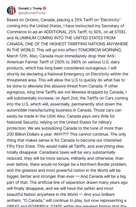 Donald Trump ha ordenado al Secretario de Comercio imponer aranceles adicionales que oscilarán entre el 25 % y el 50 % sobre todo el acero y aluminio importado desde Canadá a Estados Unidos. Tras el anuncio, el dólar se fortalece. Los cambios entrarán en vigor a partir de mañana.