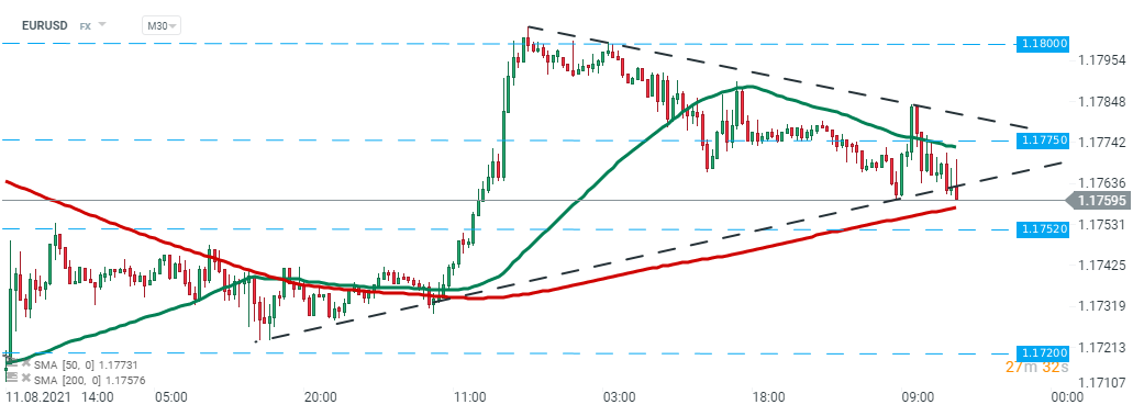 El EURUSD rompió por debajo del límite inferior de la formación del triángulo después de la publicación de los datos de hoy y se dirige hacia el siguiente nivel de soporte en 1,1752. Fuente: xStation5