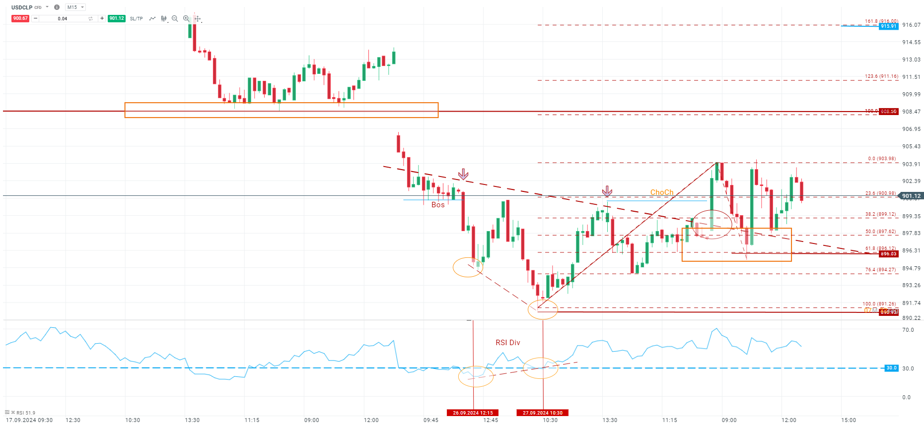 Como resultado de esta combinación de factores, el par USD/CLP ha experimentado una mayor volatilidad. A pesar de una leve recuperación desde los mínimos recientes, el tipo de cambio sigue manteniendo la tendencia bajista iniciada a mediados de septiembre. Para que el dólar logre un repunte significativo, deberá superar la resistencia en el rango de 905-907 pesos por dólar. En caso de que el informe ADP que se publicará mañana decepcione, es probable que el dólar continúe bajo presión, llevando al tipo de cambio a niveles cercanos a los 891 pesos por dólar.