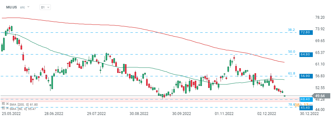 Las acciones de Micron Technology (MU.US) comenzaron la sesión de hoy con una hueco de precios bajista y se están moviendo hacia un soporte importante en 48.40 $, donde se encuentran los mínimos recientes. En caso de que se produzca una ruptura a la baja, el próximo soporte a observar se encuentra en 45,40 $ marcado con un retroceso de Fibonacci del 78,6% del impulso alcista de marzo de 2020. Por otro lado, si los compradores logran detener las caídas en el soporte mencionado anteriormente, entonces en otro impulso alcista se podría alcanzar la resistencia de 56.90 $. Fuente: xStation5