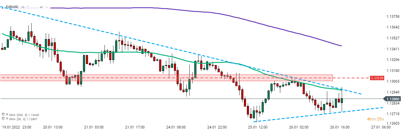 EURUSD borró las ganancias diarias tras el anuncio de la decisión del FOMC y ahora cotiza con pocos cambios en el día cerca de ambos límites del patrón triangular. Fuente: xStation5