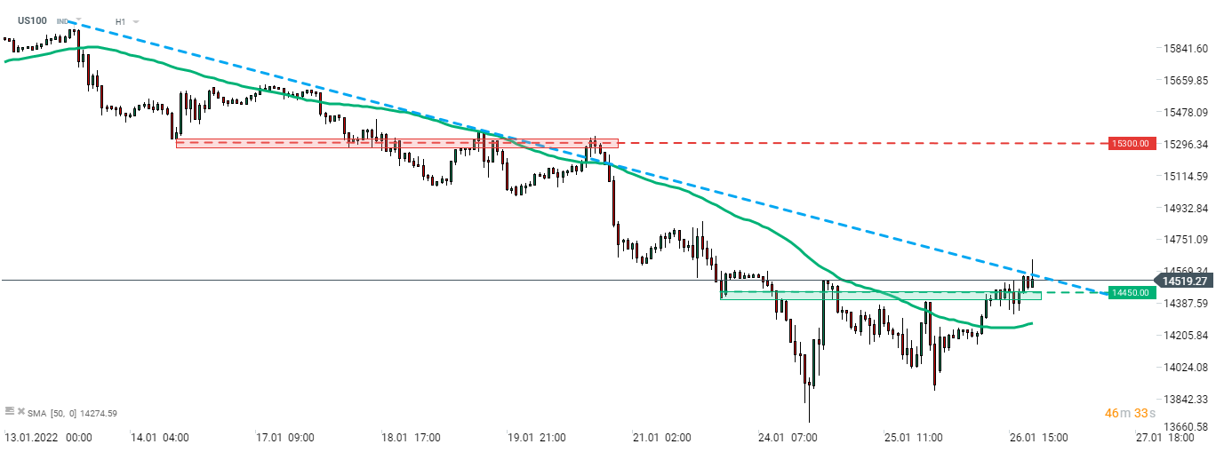 US100 probó el área de 14,600 pts después de la decisión del FOMC, que está marcada con la línea de tendencia a la baja. El movimiento inicial hacia abajo se borró parcialmente. La atención de los mercados se dirige a la prensa de Powell a las 7:30 p. m. GMT. Fuente: xStation5