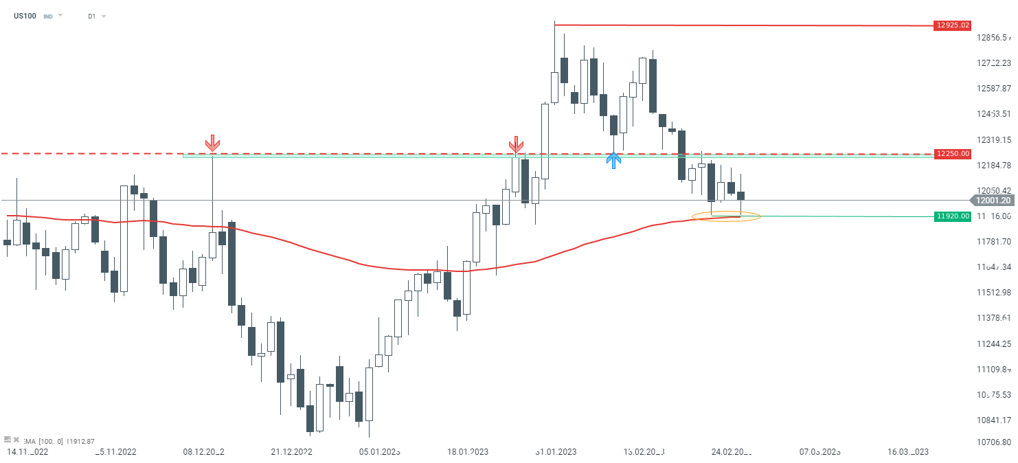 US100 comenzó la sesión de hoy con un movimiento a la baja. Sin embargo, mirando el intervalo D1, el impulso bajista se detuvo en la EMA de 100, que actúa como soporte clave a corto plazo. Si se produce una ruptura a la baja, el movimiento hacia abajo puede ganar fuerza. De lo contrario, si el precio se mantiene por encima de la mencionada EMA, se puede lanzar otro impulso alcista hacia la zona de resistencia en los 12,250 pts Fuente: xStation5