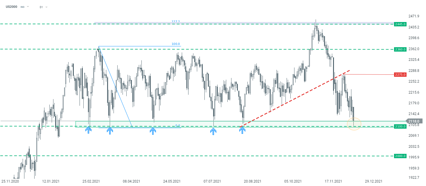 Echando un vistazo al gráfico de US2000, se puede ver que el índice rompió por debajo de la línea de tendencia local que luego actuó como una resistencia (2275 puntos). Sin embargo, el movimiento bajista alcanzó un área de soporte clave, donde aparecieron los compradores (2100 pts). Según el clásico del análisis técnico, el rebote de este soporte puede presagiar una reanudación de la tendencia alcista. Por otro lado, si se rompe el soporte de 2100 pts mencionado anteriormente, el nivel de 2000 pts será el próximo soporte clave a tener en cuenta.