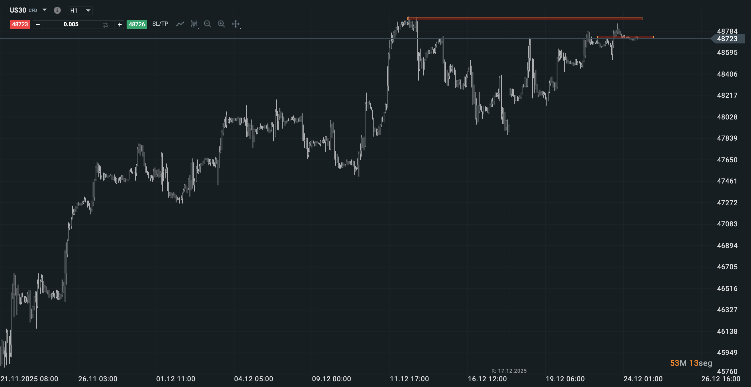 Lo realmente interesante aparece a partir del 22 de diciembre. Ese día el índice entra en una fase de pausa, algo totalmente lógico tras varias sesiones de subida. El mercado deja de avanzar, se comprime, y empieza a testear la paciencia de los traders que llegan tarde. Al día siguiente, el 23 de diciembre, se produce una ruptura del soporte en falso: el precio intenta romper a a la baja, no encuentra continuidad inmediata y retrocede. Esa falsa ruptura suele ser justo lo que limpia stops débiles y enfría el exceso de optimismo.