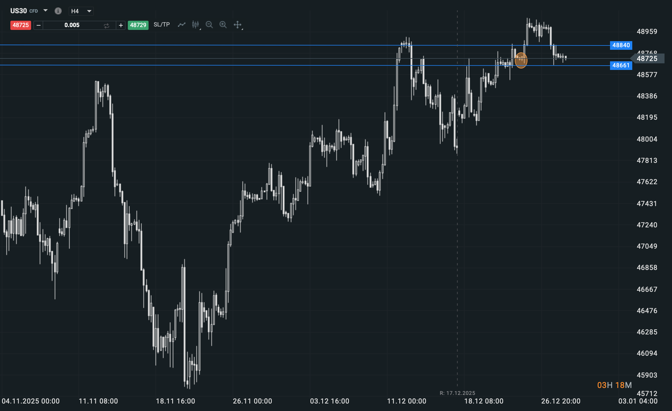En resumen, el US30 se encuentra en una encrucijada técnica y narrativa. Mientras el mercado asimila la pausa de la Fed, las maniobras políticas en torno a su futura presidencia y un cierre de año sin grandes referencias macro, el precio manda. 48.661 y 48.840 no son simples cifras, son los puntos que decidirán si esta consolidación en máximos es solo una pausa antes de seguir subiendo o el inicio de algo más complejo. Hasta que uno de ellos ceda, la paciencia o las operaciones a muy corto plazo, siguen siendo la mejor posición.