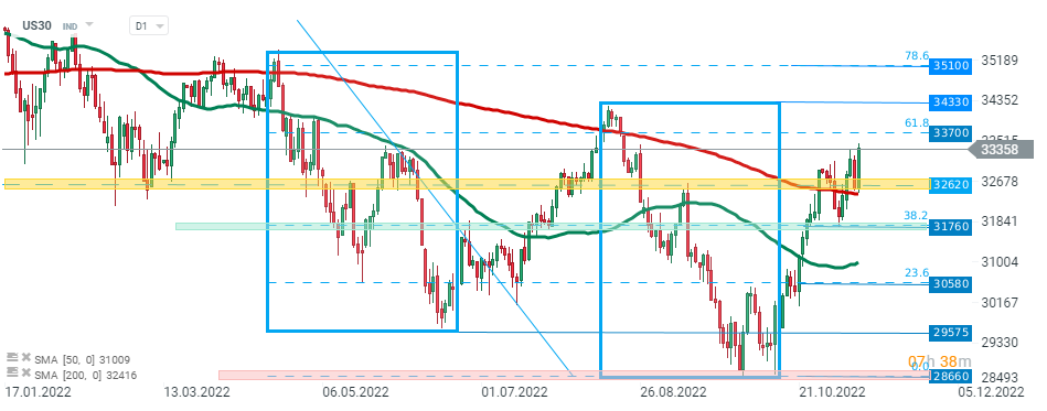 Desde un punto de vista técnico, el US30 rebotó en la principal zona de soporte alrededor de los 32620 pts y alcanzó el nivel más alto desde fines de agosto de 2022. Si prevalece el sentimiento actual, la resistencia en 33700 puede estar en riesgo. Este nivel está marcado con un retroceso de Fibonacci del 61,8% de la última onda bajista. Fuente: xStation5