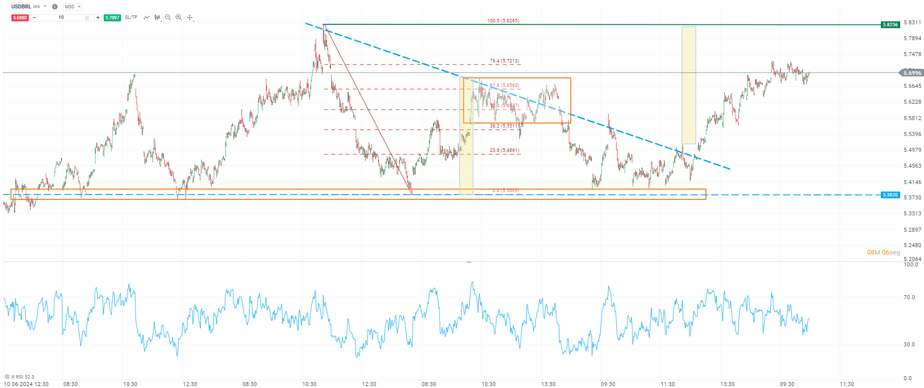 El par USD-BRL rompió una línea de tendencia bajista relevante. El precio ha respetado un soporte clave en 5.3820, desde el cual rebotó y mostró una recuperación significativa. El análisis de retroceso de Fibonacci indica que hay una resistencia cercana en 5.6563, correspondiente al nivel del 61.8%.