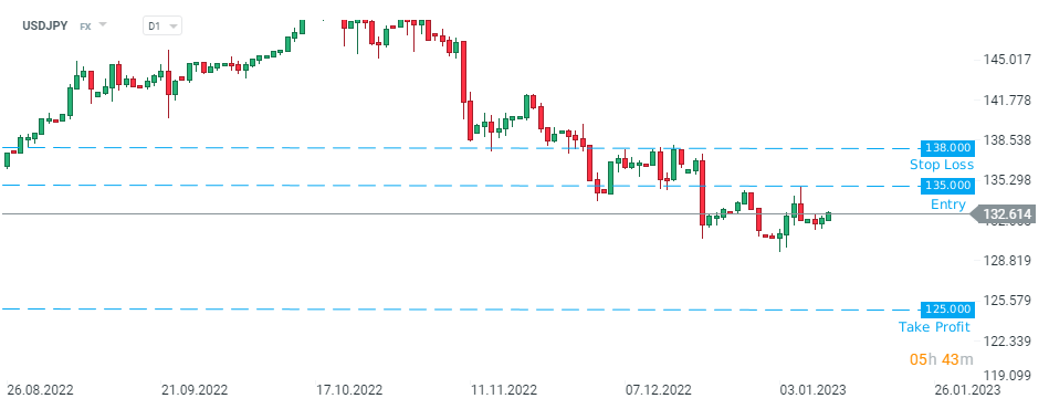 Credit Suisse recomienda tomar una posición corta en USDJPY a 135,00 con un objetivo de 125,00 y una orden de stop loss colocada en 138,00. Fuente: xStation5