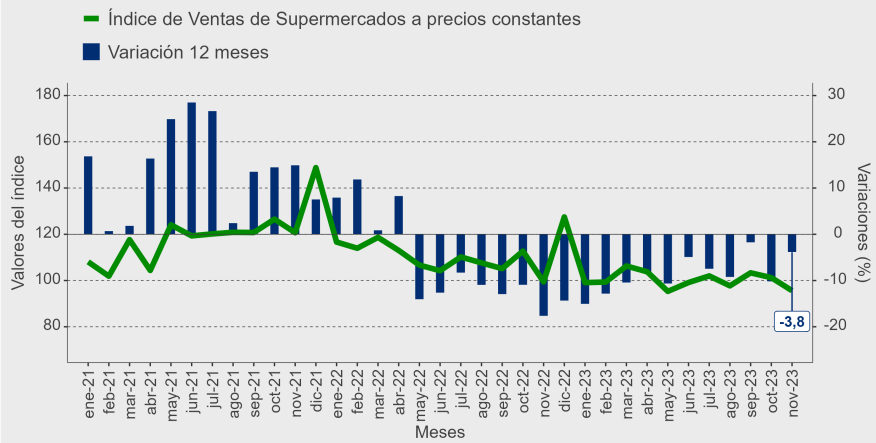 - El Índice de Ventas de Supermercados (ISUP) también disminuyó un 3,8% en doce meses, acumulando una baja del 8,7% en los primeros once meses del año.