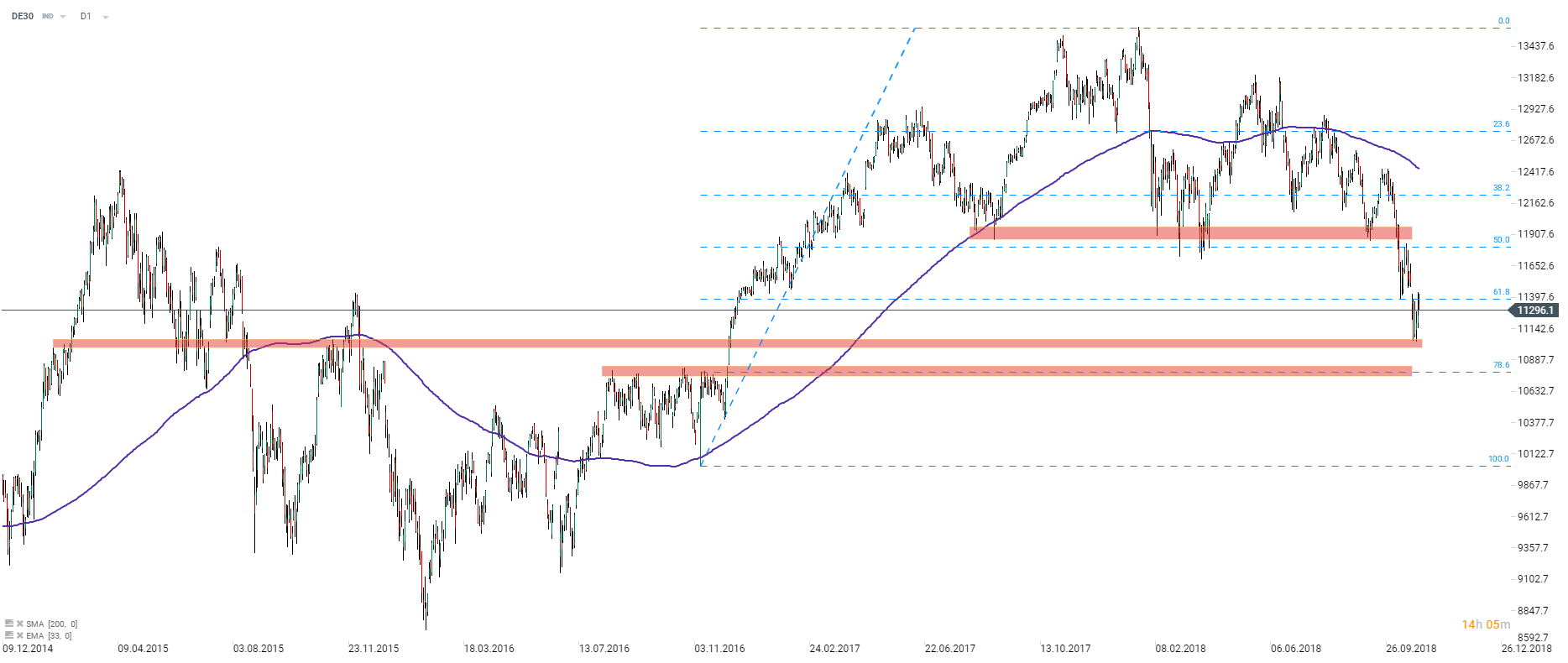 El DAX (DE30 en xStation5) tiene problemas en las cercanías del nivel 61.8% de Fibonacci