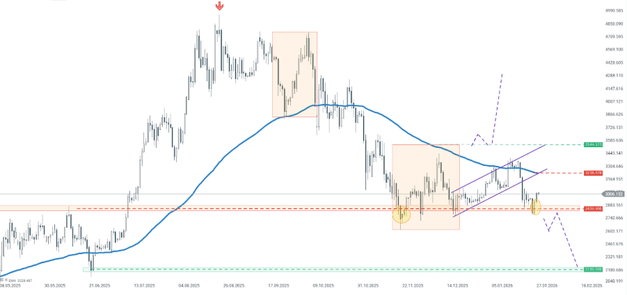 Sin embargo, para que se desarrolle una tendencia más clara, el mercado tendría que romper su estructura actual. Una ruptura por debajo del nivel de soporte en 2.850 dólares abriría el camino hacia 2.190 dólares, mientras que una ruptura por encima de 3.540 dólares daría la oportunidad de un regreso a la tendencia alcista. En este punto, la dirección sigue indecisa.