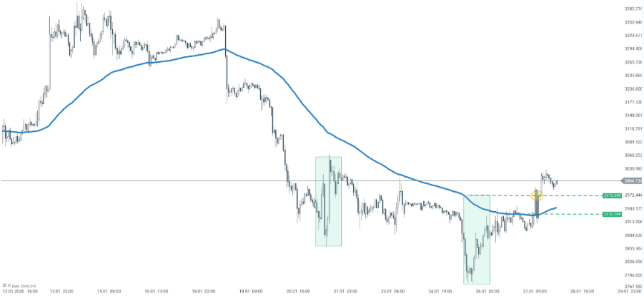 En el intervalo inferior H1 (cada vela es equiparable a 1 hora), llamamos la atención sobre la media y la geometría 1:1. A pesar de la reacción inicial de la oferta, el precio de Ethereum logró superar ambas resistencias significativas: 2.932 y 2.972 dólares. A corto plazo, este patrón aumenta las probabilidades del lado de la demanda y puede apoyar un escenario de continuación alcista, siempre que los niveles superados se mantengan.
