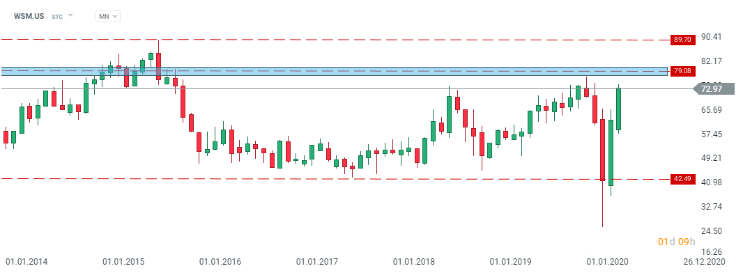 Williams-Sonoma (WSM.US) subió después de que la compañía publicara los resultados trimestrales. Actualmente, el precio se cotiza alrededor de $ 79.00 por acción, por encima de los niveles previos a la pandemia. Fuente: xStation5