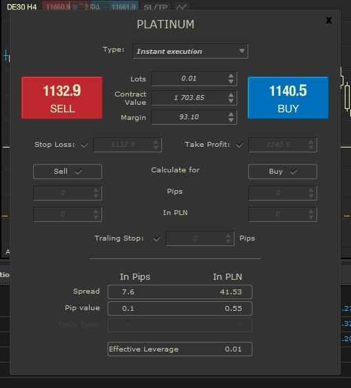 La calculadora nos permite introducir órdenes de ejecución instantánea y órdenes pendientes. Determina el tamaño de la orden y el valor del contrato, y el margen requerido se calculará automáticamente. Puedes elegir niveles para los Stop Loss y Take Profit, y la cantidad específica de beneficio o pérdida se mostrarán automáticamente. En la parte inferior de la calculadora te informa del spread en pips y la divisa, y el valor de un pip. Esto te permite controlar el costo y ajustarte a ellos para adaptarlo a tu estrategia de trading.