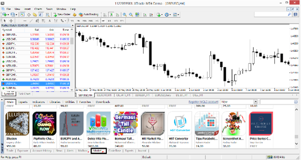 1. Cuando haya ingresado en la plataforma MT4, seleccione la pestaña “Mercado” en la parte inferior de la plataforma. Después de esto, verá una lista de las muchas herramientas de análisis técnico pagadas disponibles, aunque también se incluyen algunas gratis.