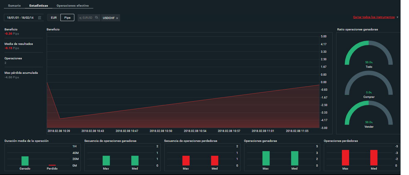 En el menú superior derecho podrá encontrar 3 guiones que le llevarán a "configuración" "cuenta".. En "cuenta" podrá encontrar estadísticas de operativa de sus posiciones cerradas, por ejemplo: beneficio máximo, media de resultados, máximo descenso y más. El análisis de estos datos resultan importantes para llevar un seguimiento de la inversión.