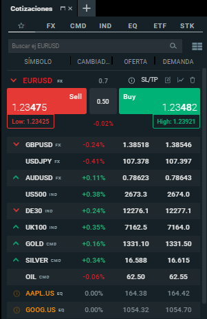 En esta sección de la plataforma, puedes elegir aquellos instrumentos en los que estás interesado entre nuestras principales categorías (Principal, FX, Materias Primas, Índices, Acciones CFDs y ETFs), o puedes personalizar las tuyas propias. Como puedes observar, también puedes operar desde esta ventana.