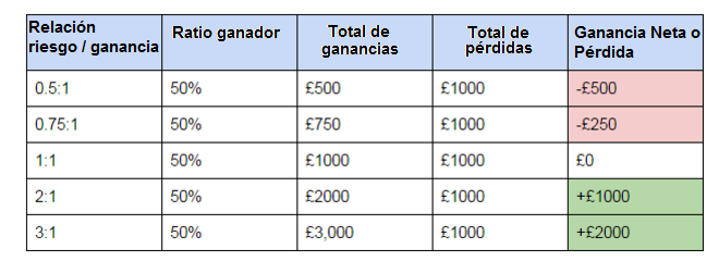 Se puede ver claramente en la siguiente tabla los beneficios potenciales de tener una relación de riesgo / beneficio positivo y cómo esto puede afectar a su rentabilidad neta.