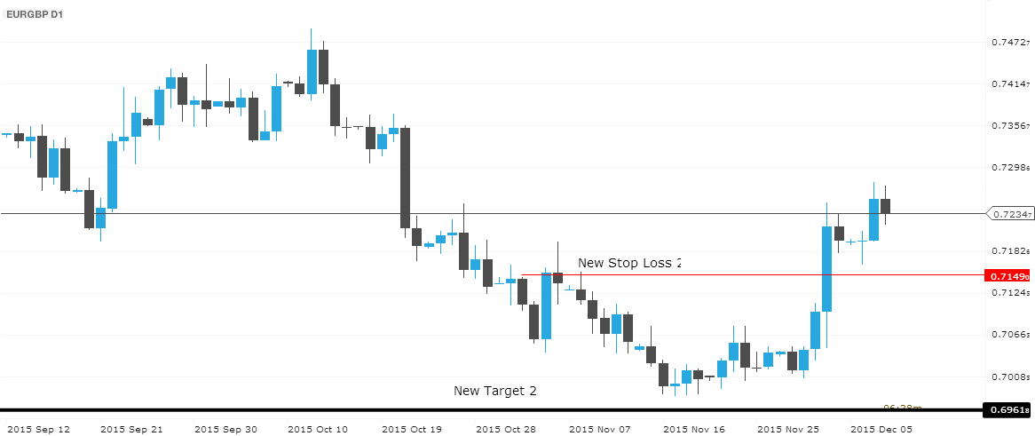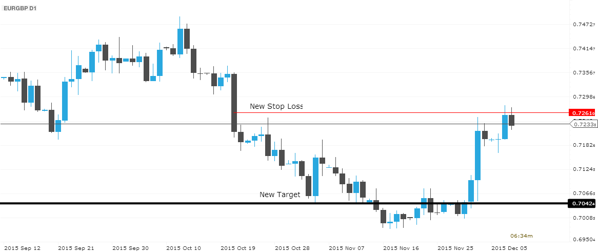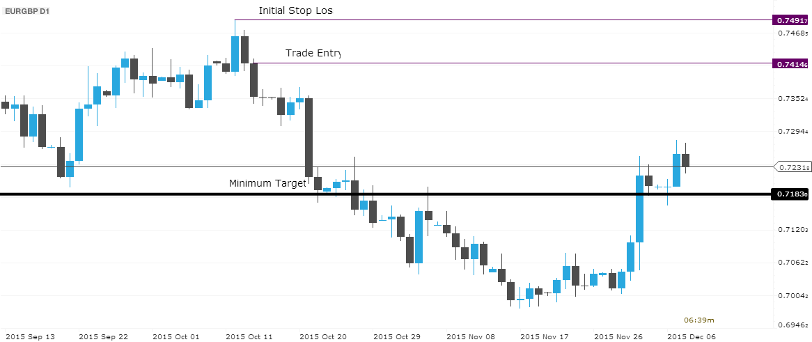 Aquí, el trader abre una operación EUR/GBP, determinando un stop loss y el target mínimo tres veces superior al valor del stop loss.